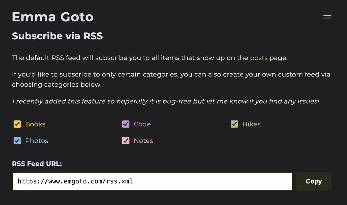 As part of this update, I decided to show all of my posts in my RSS feed, including all photos, book reviews and notes. Previously I was a bit more intentional with only showing what I felt were “proper” posts on the feed.