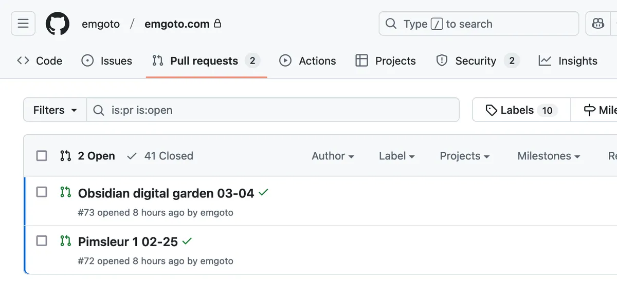 After I write a post in Obsidian, I generally just copy-paste the markdown file (or folder, if it has images) from Obsidian into my git repo for my blog. If I am writing a note, I do have a slightly more streamlined approach where I have a Obsidian plugin that does the copy-pasting for me.