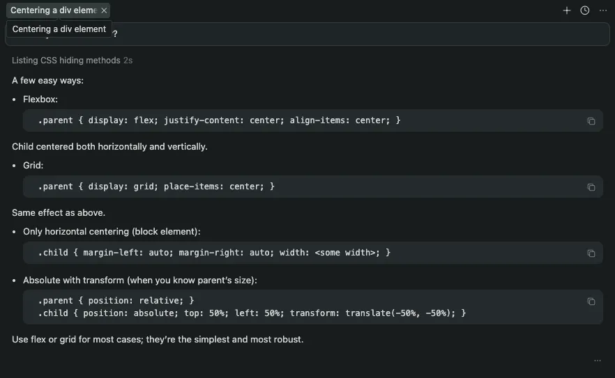 The caveat here is that AIs tend have a tendency to “hallucinate” or be confidently incorrect. For a CSS question like centering a div, I’m sure that exact question has been asked on Stack Overflow before and so it’s quite good at answering it. But the more niche the question, the more you need to take it with a grain of salt. If you are not sure of its answer, you can ask it to “please provide sources” and it may re-evaluate and realise it lied to you in its previous response.