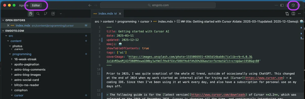 Cursor has gone through so many design changes since I began using it that it’s kind of hard to keep track. If you want something that’s the closest to VSCode, you will want to start in Editor mode, which you can see in the top left corner of your window:
