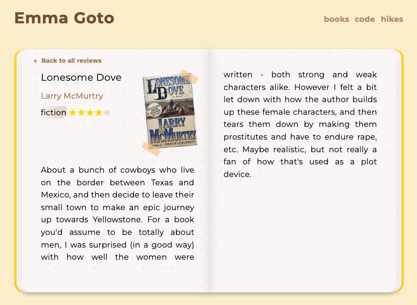 I had a bit of fun with it, and so my current design has a notebook theme. I have all my reviews listed as though they are on one long notepad. You can also filter by genre and star rating.