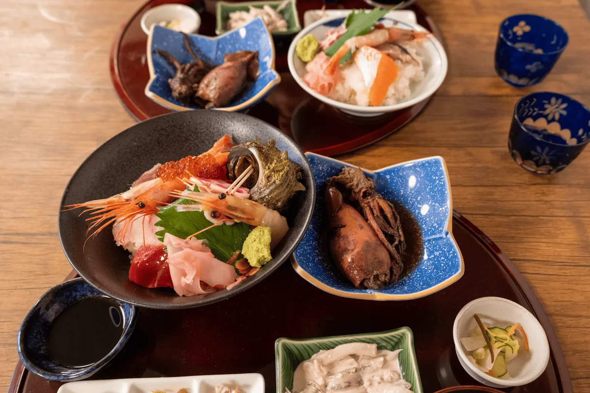 This one serves seafood - and it was such good value for money. We got the “Totoya-no-kaisendon” - they have normal and large sizes (1600 yen and 2500 yen). Usually I’d assume the size difference only refers to the quantity of rice, but in this case you get a lot more seafood piled up on top as well. I only got the standard but my partner was nice enough to give me some ikura (my fave) from his large-sized one too.