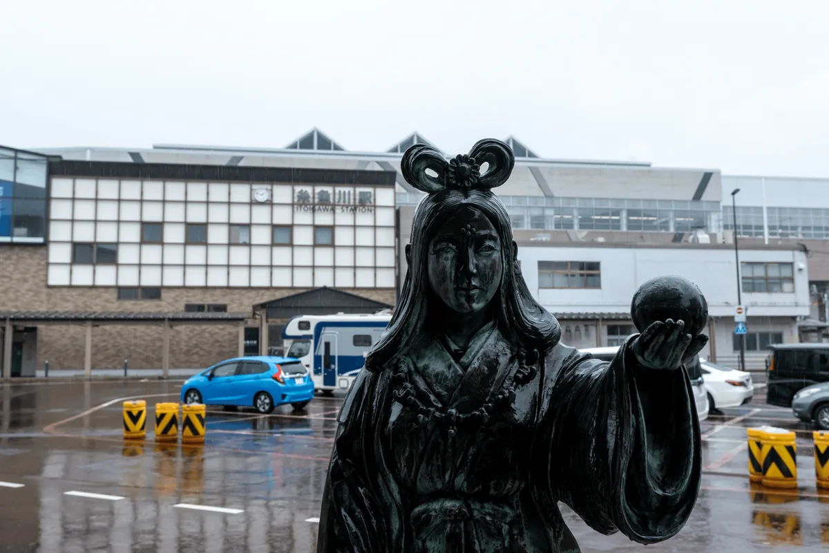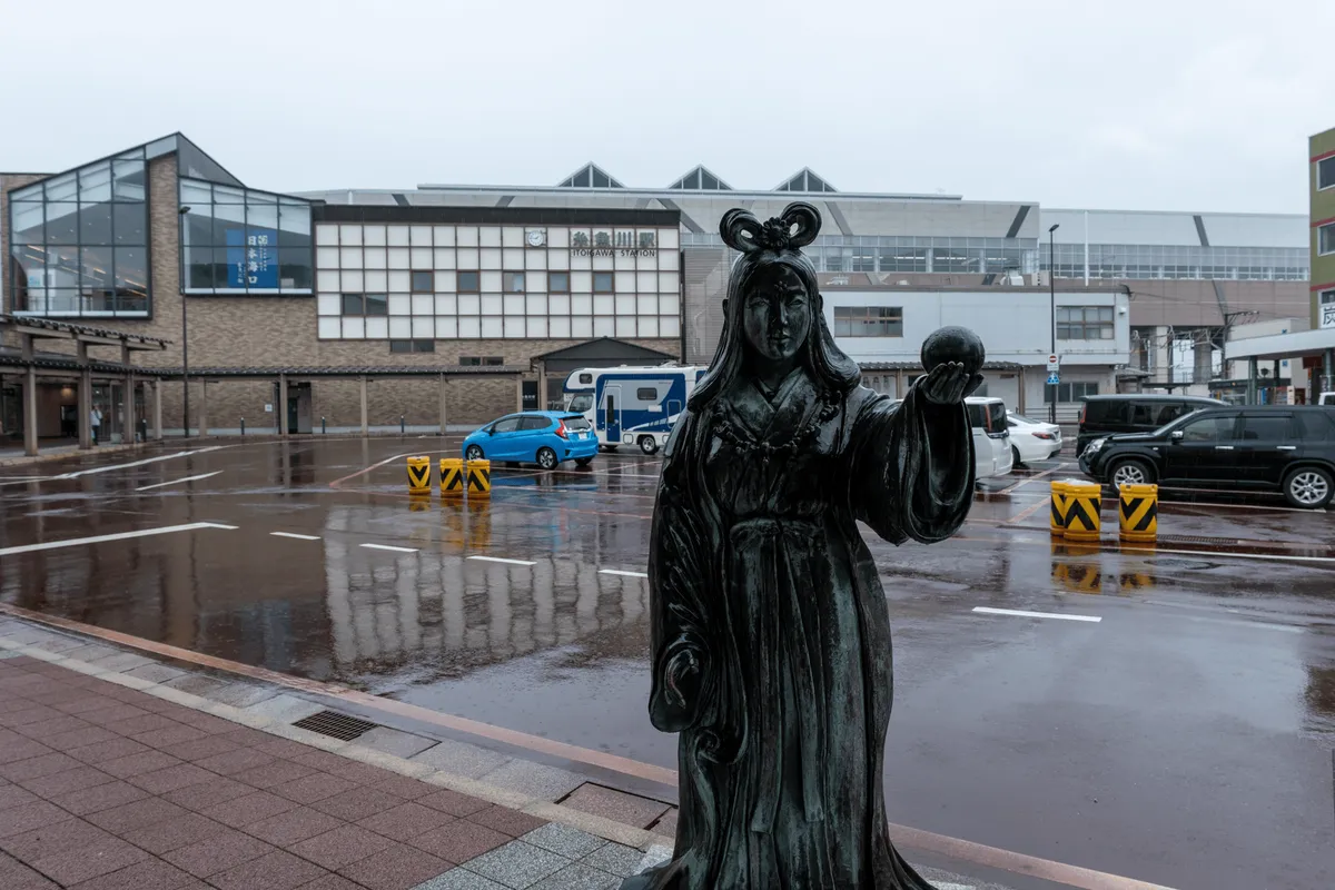 Finally, we said hello to the statue of Princess Nunakawa outside the station. She features in legends as a ruler of this area in ancient times, and of course wears a jade necklace (I suppose the big ball she holds might be a jade as well).