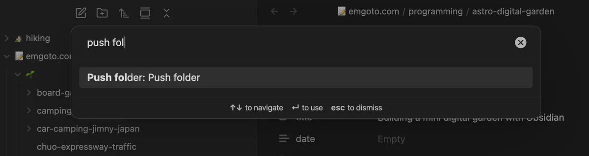 - I run a custom “Push folder” command in Obsidian, which copy-pastes my notes from Obsidian into a dedicated notes folder in my website’s git repo