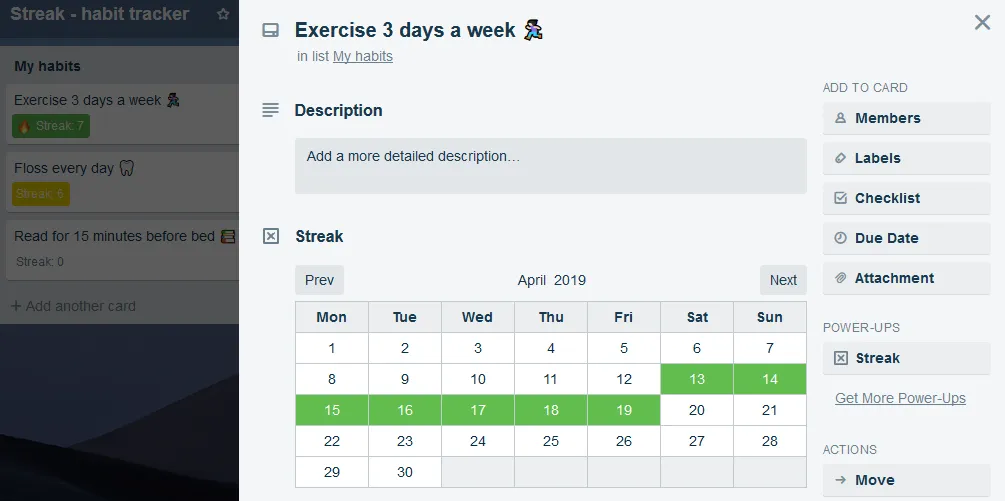 Streak lets you check off that you've completed your habit using the calendar on the Trello card, and then you can see at a glance how you're tracking across all your habits with the little badges on the front of the cards.