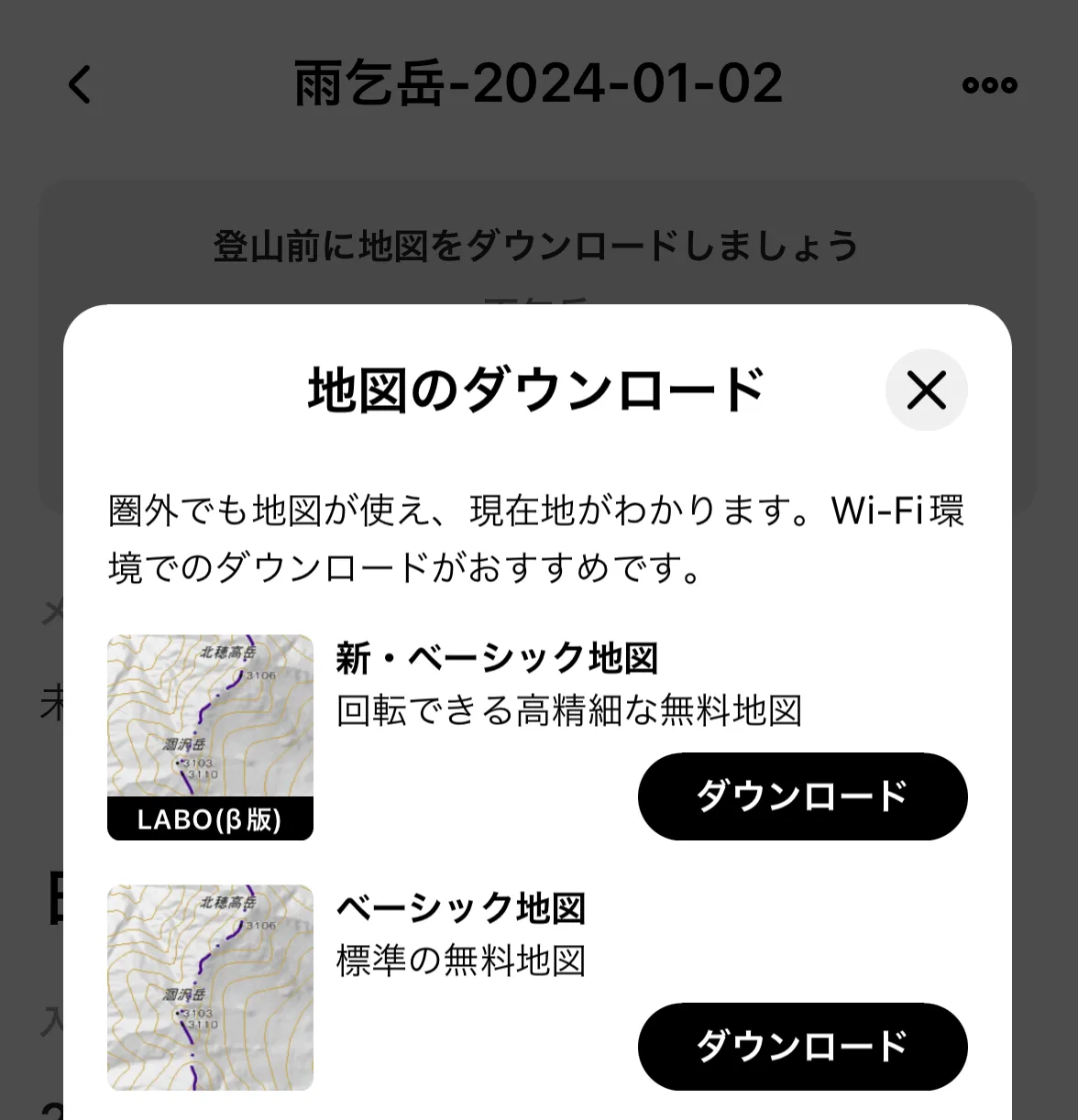 Now you’re done with your plan! You’ll see a big black black button to download the course map (地図をダウンロード). If you click that, you’ll see a list of map download options pictured in the screenshot.
